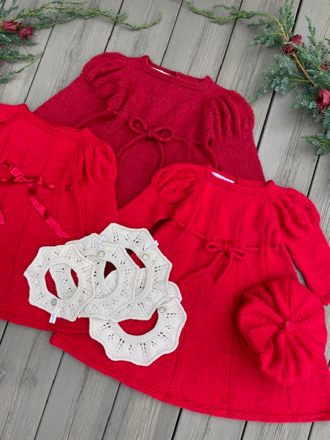 Konstruksjon: strikkes ovenfra og ned. Det er ikke benyttet vanskelige eller nye  teknikker.  Den er strikket med pinne 3 og 3,5 mm. Den øvre delen av bærestykket er strikket med pinne 3 mm. Dette er for å danne den passformen jeg ønsker. Pinneskifte skjer direkte etter økning ved puffermer. Videre er kjolen strikket med raglansøkninger og feltinndeling. Puffermene har hullmønster.